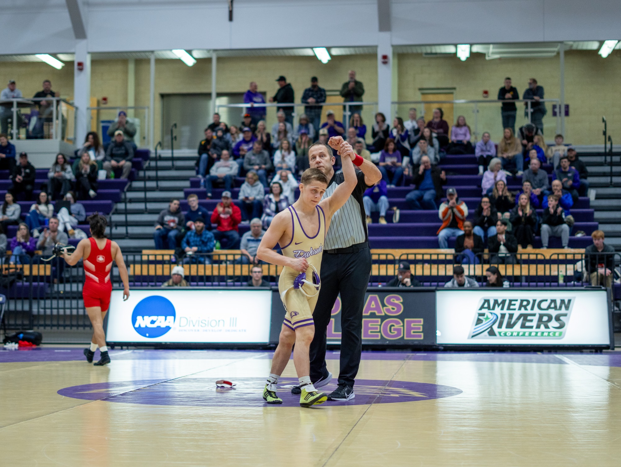 The Duhawks started their tournament with a 28-10 win over Adrian College in the prelims, winning 7-of-10 matches. The Purple and Gold had decisions by
